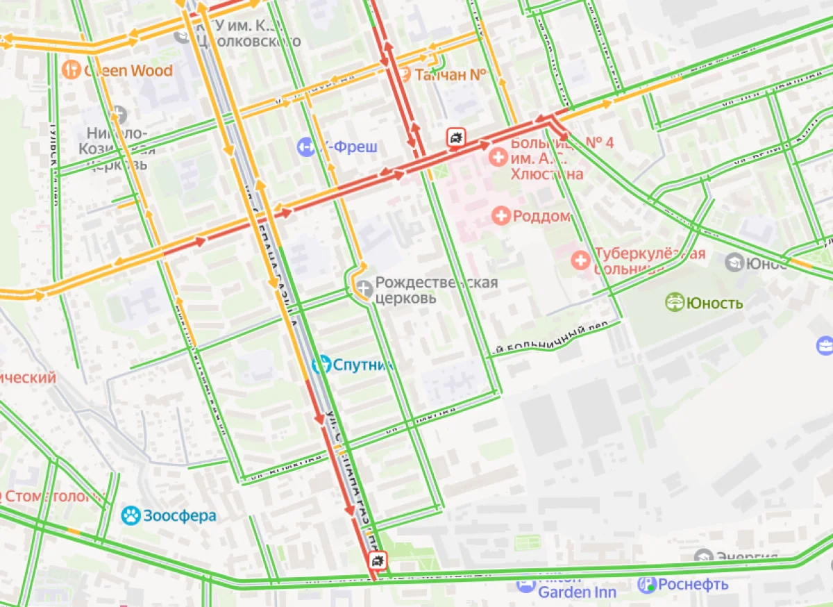 По Никитина затор образовался в обе стороны. Также в пробке стоит Горького на участке между Никитина и Тульской.