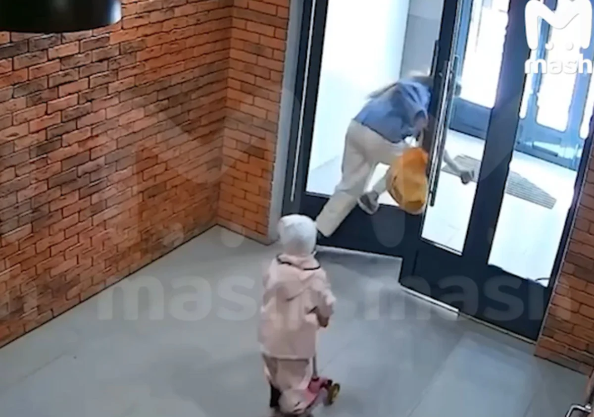 Судя по этим кадрам, дверь по какой-то причине осталась без стекла. Но жители многоэтажки, не замечая этого, пытались опереться на стекло, чтобы открыть дверь, и падали.