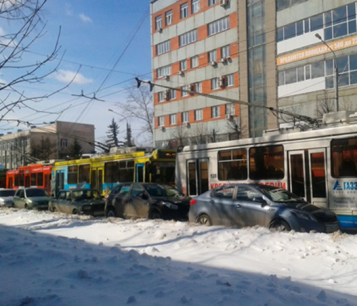 В пробке стоят несколько троллейбусов. Проехать сбоку от них невозможно из-за снега на полосе и узкой дороги. Один из водителей, пытавшийся проехать слева от троллейбуса, сам притерся к нему и застрял.