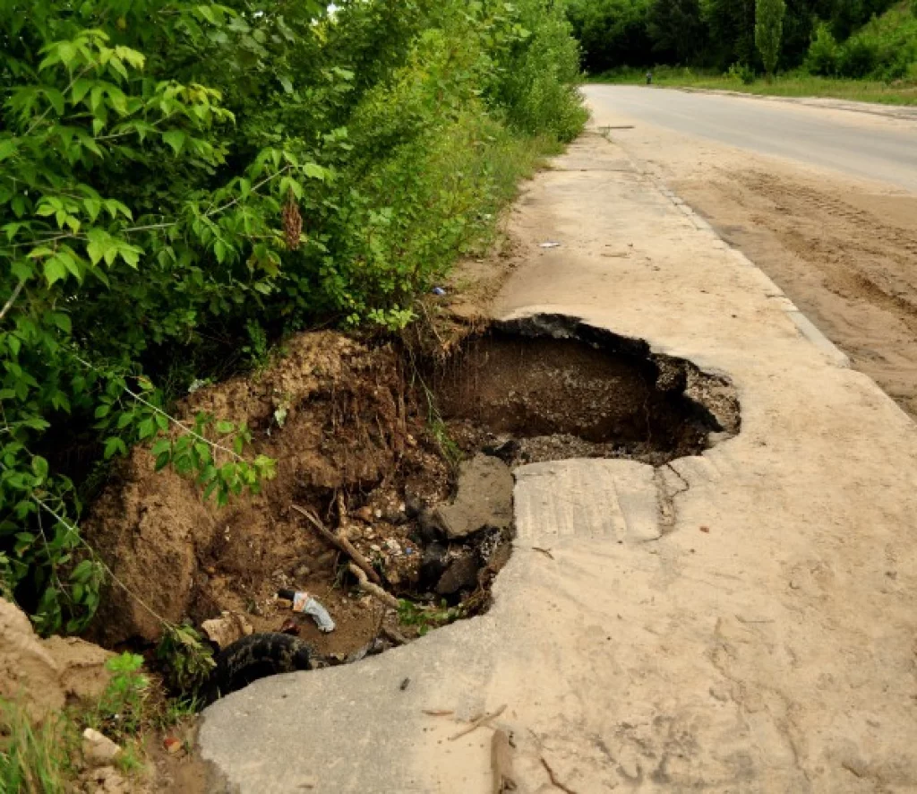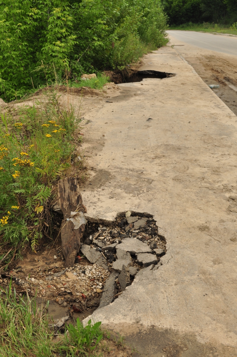 Ямы образовались на тротуаре со стороны водохранилища в двух местах. При дальнейшем размытии возможно и обрушение асфальта на проезжей части.