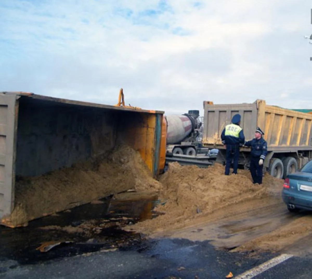 По данным МЧС, на мосту столкнулись два самосвала «Шаман» после столкновения один из них врезался в разделительный отбойник в центре проезжей части, опрокинулся и снес с десяток метров ограждения.