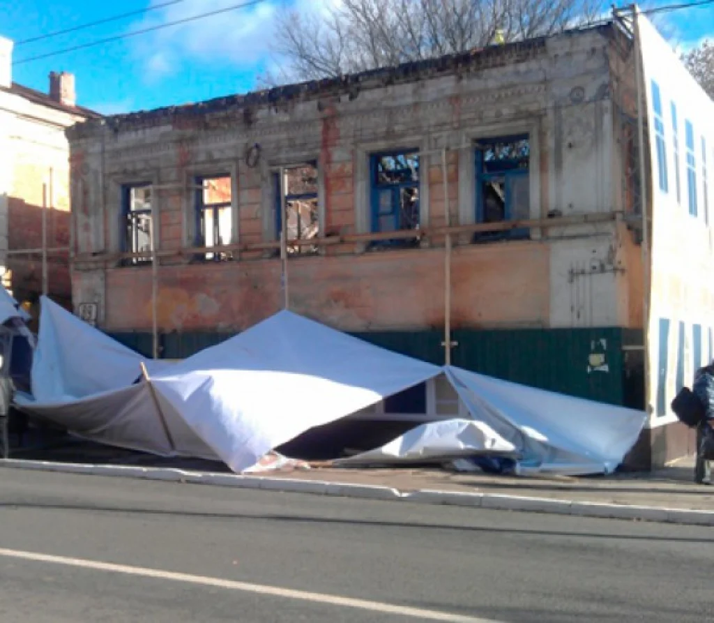 Разрушенный дом опять завесят.