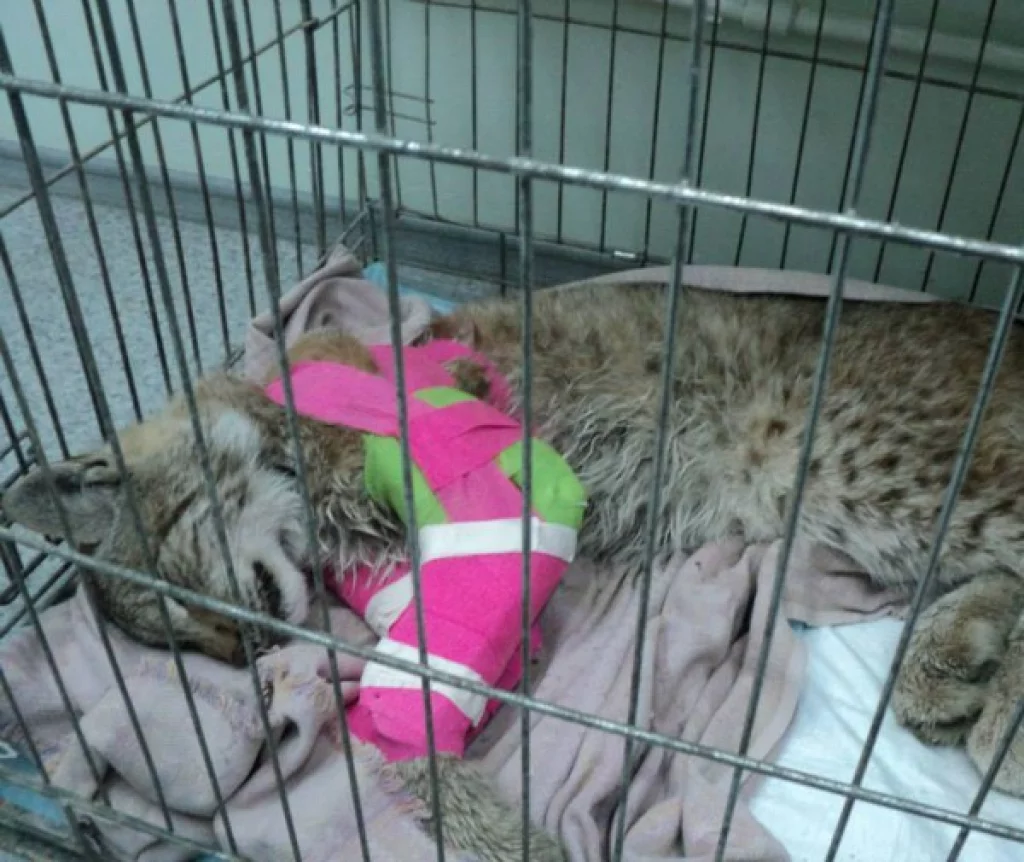 Рентген показал, что у животного закрытый перелом со смещением на обеих передних лапах. Сейчас рысь готовят к операции.