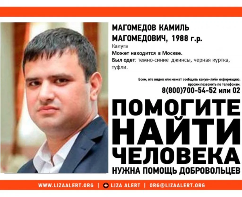 Еще в конце сентября в Калуге женщина написала заявление в полицию о том, что уже около 5 дней ее 26-летний сын Камиль Магомедов, живущий в Смоленске, не выходит на связь. На днях к поиску пропавшего подключился и Добровольный Поисковый Отряд «Лиза Алерт».