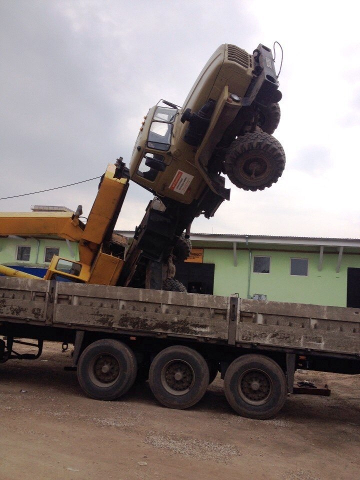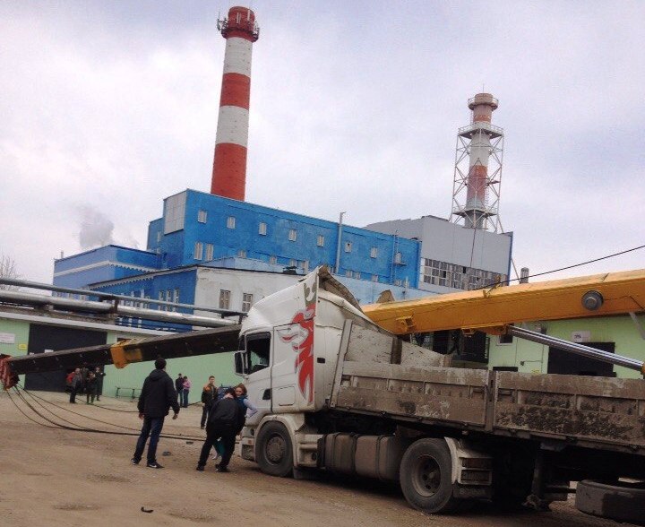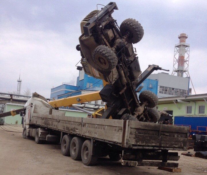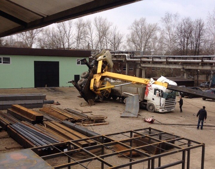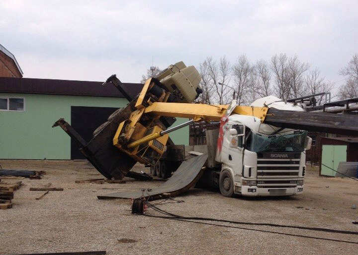 При разгрузке фуры в Калуге перевернулся автокран. Фотографии утром в понедельник, 27 апреля, в социальной сети «ВКонтакте» выложил Максим Федин.