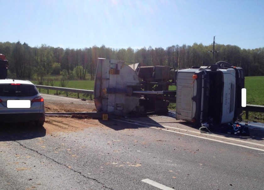 Днём в среду, 6 мая, на Киевской трассе в Малоярославецком районе перевернулся грузовик Iveco Trakker.