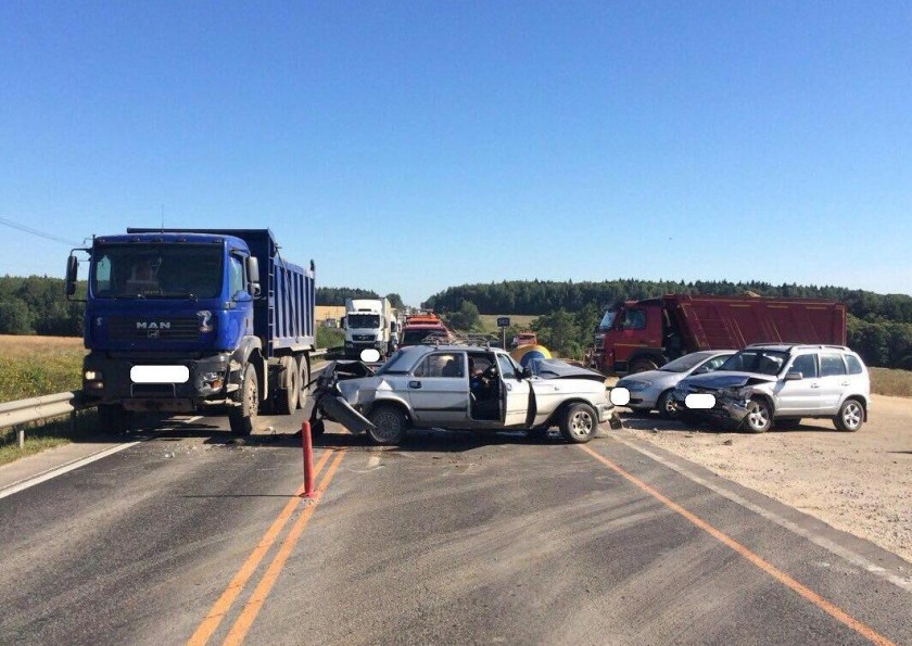 Около 08:40 ехавший в сторону Калуги самосвал MAN «догнал» попутную «Волгу». Ударом легковушку отбросило на встречную полосу, где она врезалась в «Шевроле-Нива». А эта машина отлетела на «Тойоту Королла», сообщают в дорожной полиции.