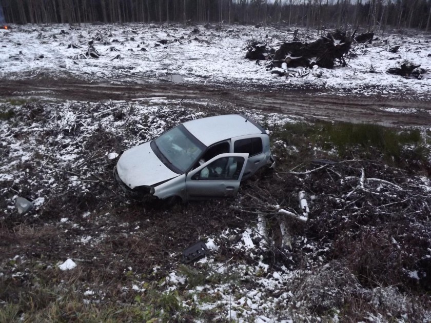 Водитель манипулятора Scania уронил бревно рядом с легковым автомобилем Renault Clio в понедельник, 16 ноября, на 91-м километре трассы А101.