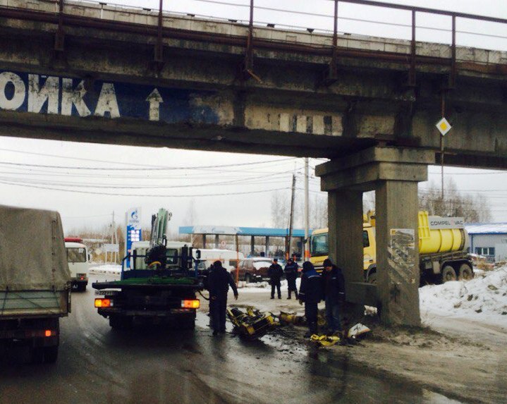 В момент проезда манипулятор зацепился за мост и обломался. К счастью, конструкция не попала на двигавшуюся следом легковушку.