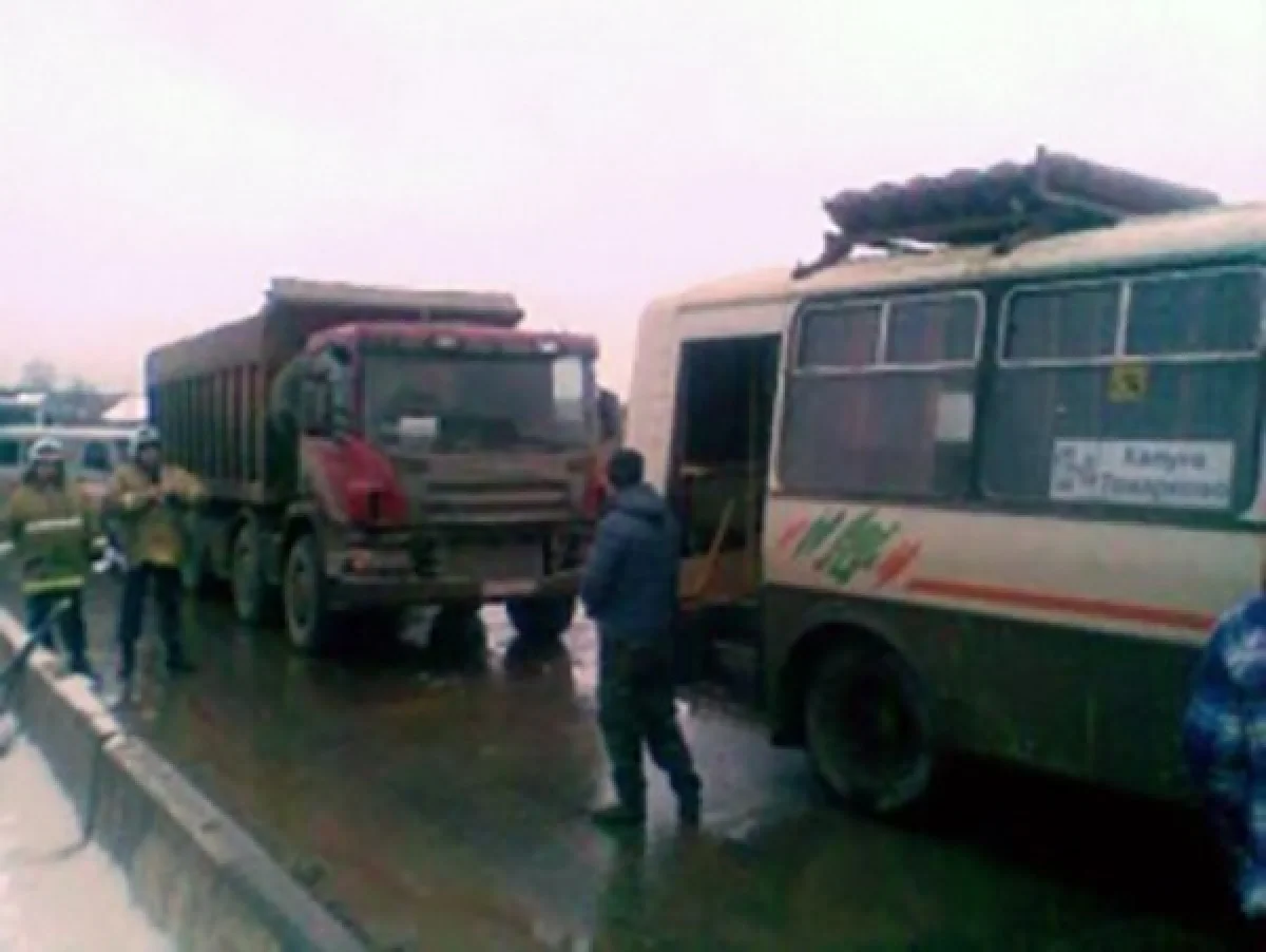 По предварительным данным инспекторов, водитель грузовика Scania не соблюдал дистанцию и «догнал» автобус, ехавший с самосвалом в одном направлении.