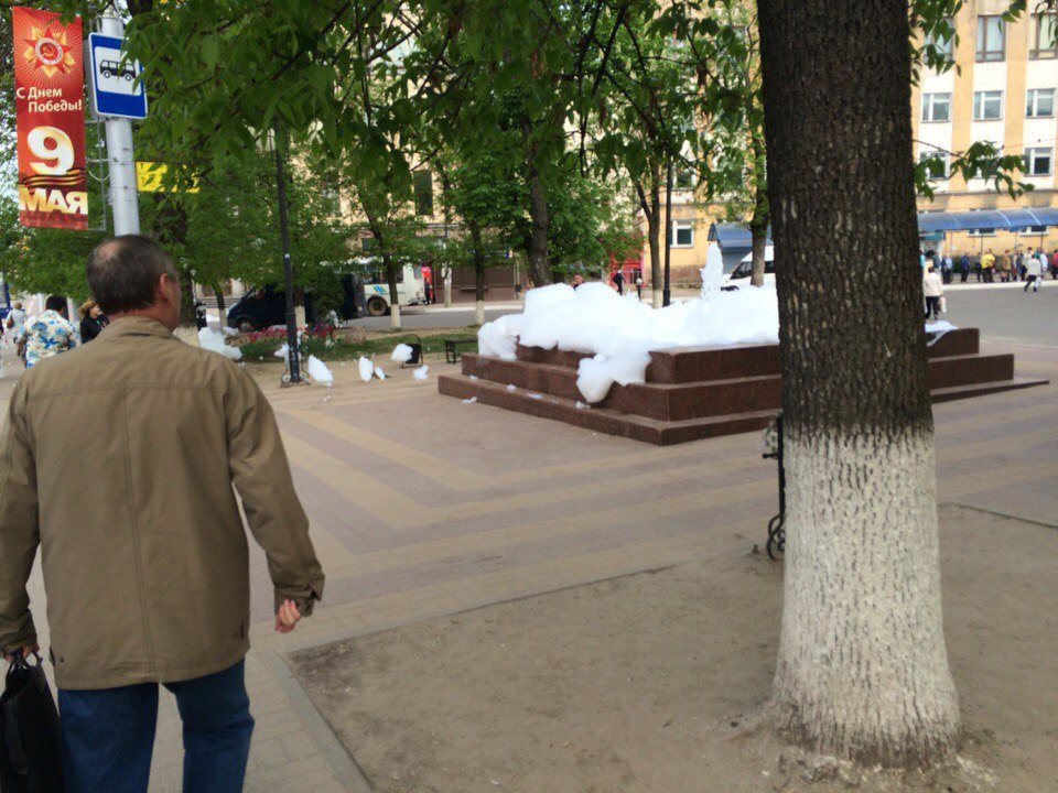 Фонтан в сквере Медсестёр в Калуге заполнила пена. Фотографии утром в четверг, 12 мая, выложил в социальной сети «ВКонтакте» Павел МИРОНОВ.