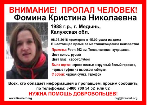 В воскресенье, 8 мая, в 15:00 в Медыни ушла из дома и до сих пор не вернулась 27-летняя Кристина ФОМИНА.