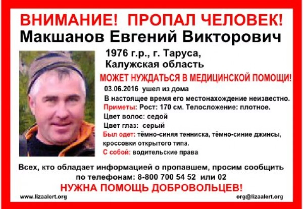 В пятницу, 3 июня, в Тарусе ушёл из дома и до сих пор не вернулся 40-летний Евгений МАКШАНОВ.