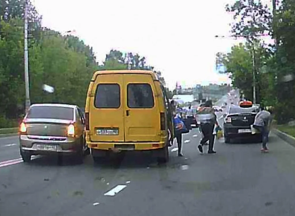 В следующую секунду водитель маршрутки резко взял влево, почти вытеснив ещё один автомобиль на встречную полосу, и остановился.