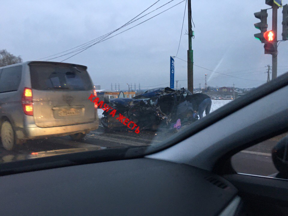 UPD. Как рассказал нам водитель грузовика, он поворачивал налево. Когда в его машину въехала легковушка, он даже не сразу понял, что произошло. Просто услышал хлопок и вышел на дорогу проверить, целы ли колеса. С левой стороны всё было в порядке. Только когда он посмотрел на правую сторону машины, стало понятно, что произошло. Удар пришелся в район заднего правого колеса. Легковушка, напомним, ехала позади большегруза.