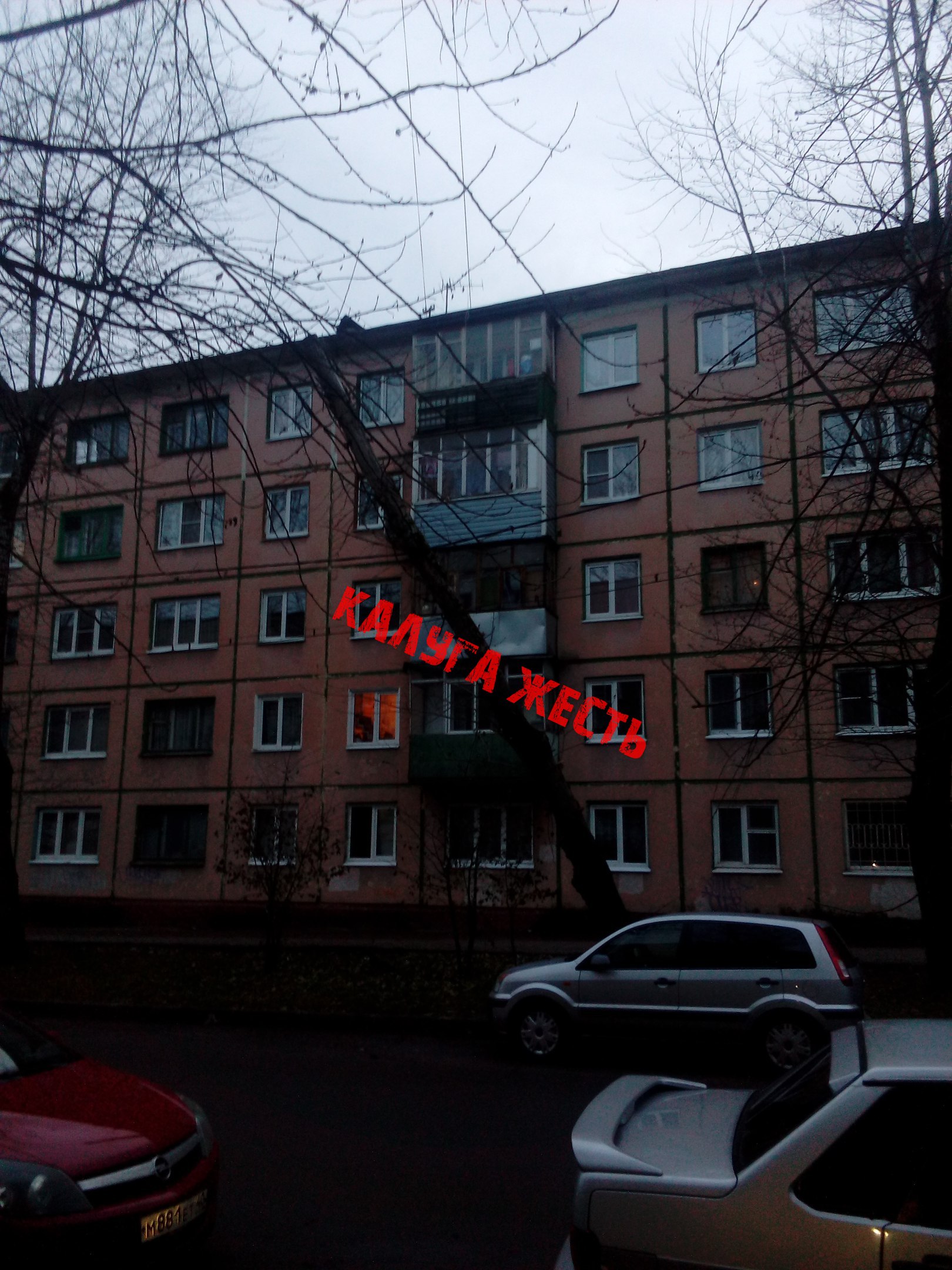 Днём в среду, 9 ноября, на улице Энгельса в Калуге у дома №80 надломилось дерево. Ствол повис над дорогой на проводах.