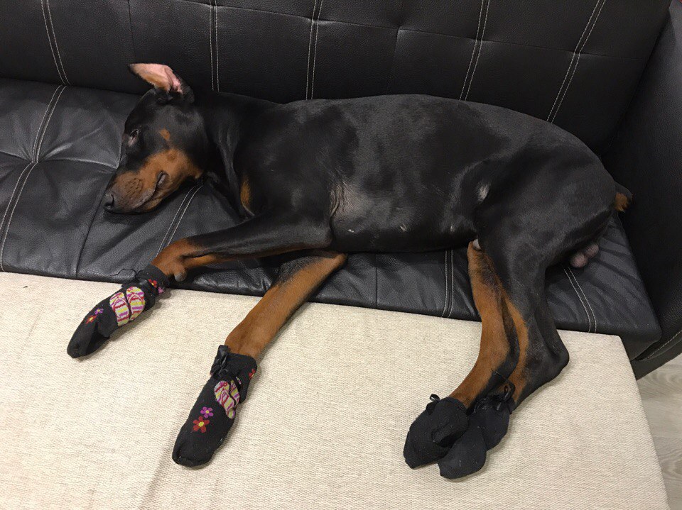 У животного сильное переохлаждение, когти и подушечки стесаны до мяса, он еле ходит.