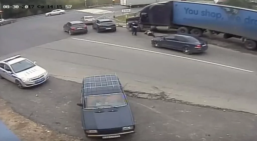 Однако дальнобойщик проигнорировал требования сотрудников и стал закрывать водительскую дверь. Полицейские пытались извлечь его из машины.