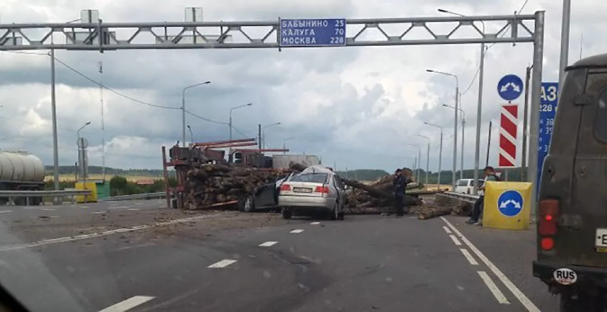 В результате произошло столкновение автомобилей Chery и Mitsubishi Lancer. А лесовоз перевернулся, и две легковушки засыпало брёвнами.