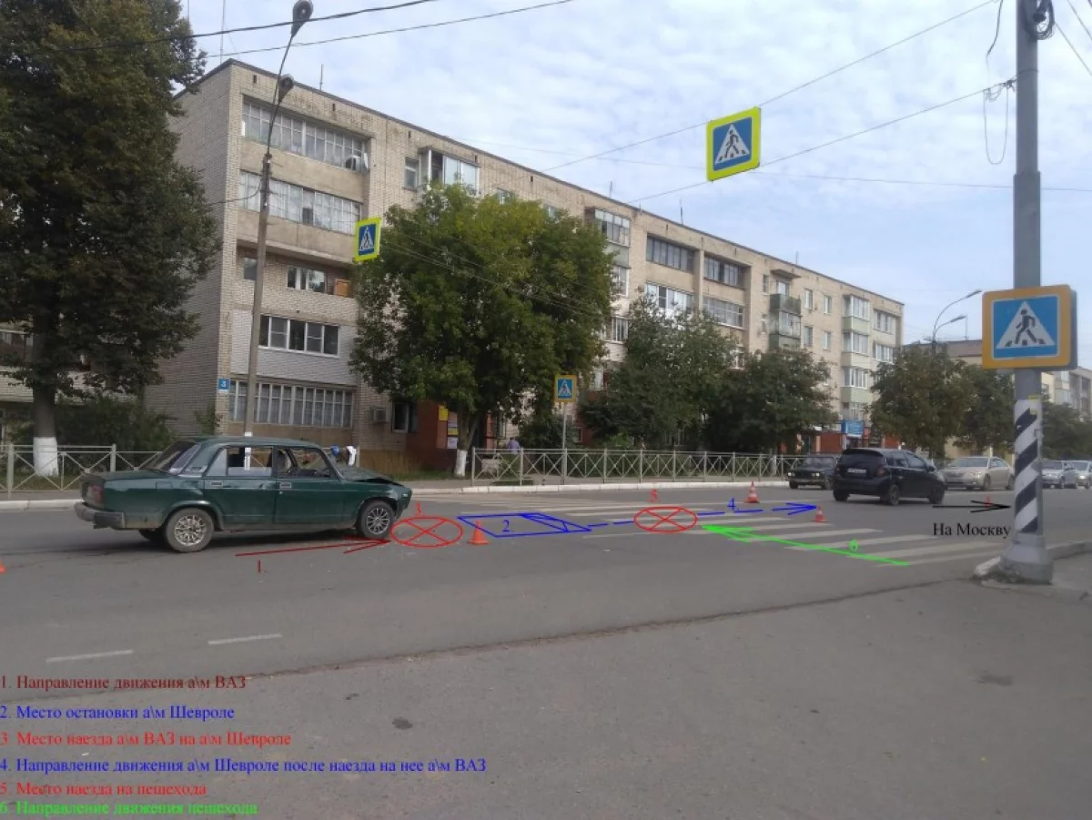 Пожилая женщина переходила трассу А-130 Москва – Малоярославец - Рославль по нерегулируемому пешеходному переходу, когда её сбила остановившаяся около «зебры» «Шевроле Авео». Наезд произошел после того, как в зад «Шевроле» въехала «семёрка».
