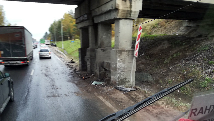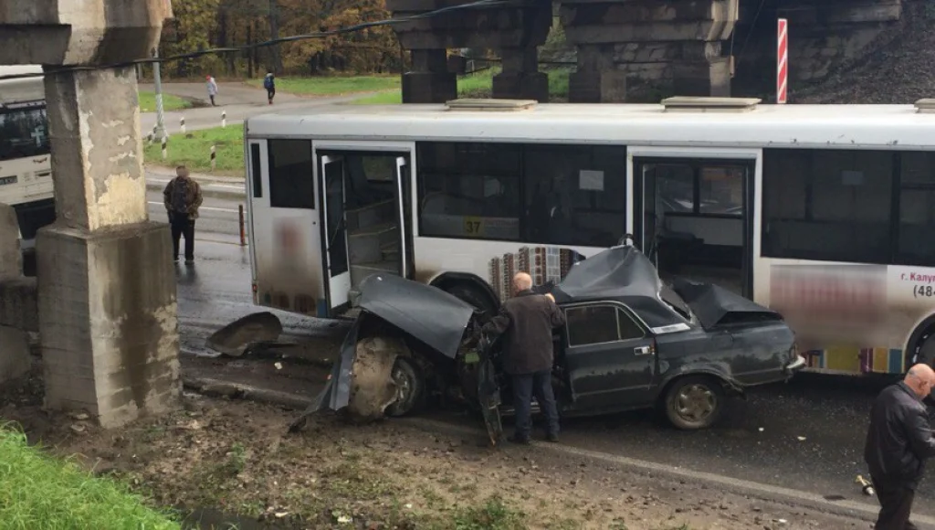 По предварительной информации, водитель «Волги» въехал в пассажирский автобус, а затем легковушка врезалась в опору путепровода. Фото появились в группе «Калуга жесть» в социальной сети «ВКонтакте».