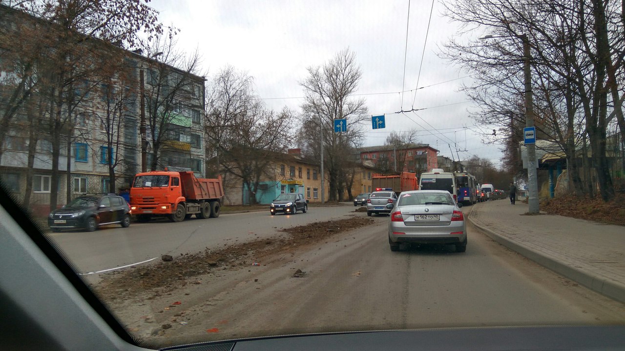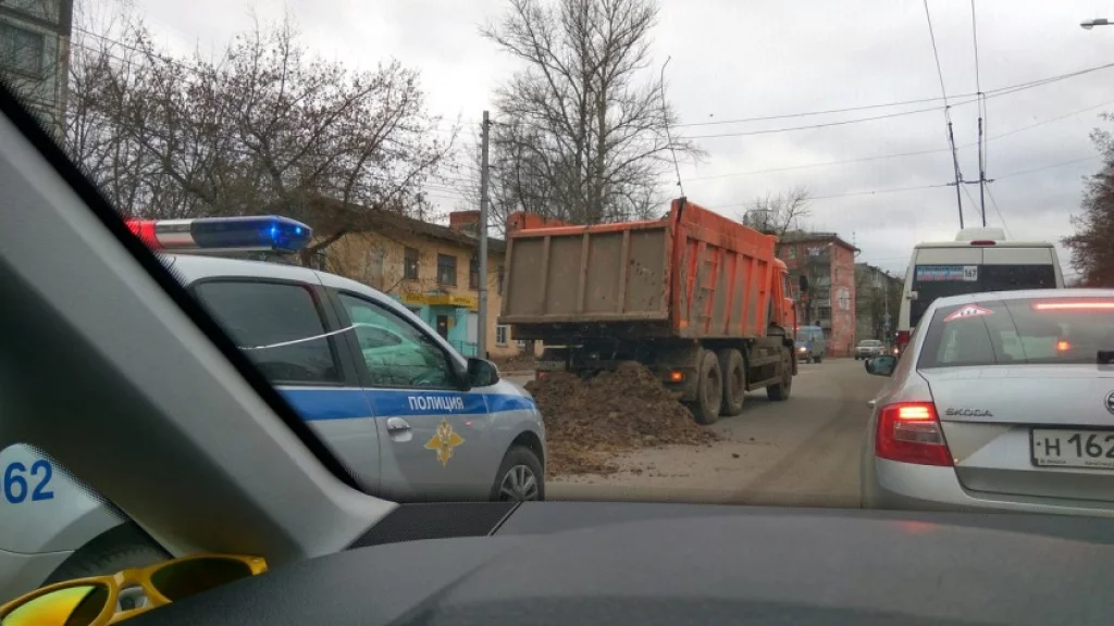 Утром в четверг, 23 ноября, на Грабцевском шоссе в Калуге грунт высыпался из двигавшегося по дороге самосвала.