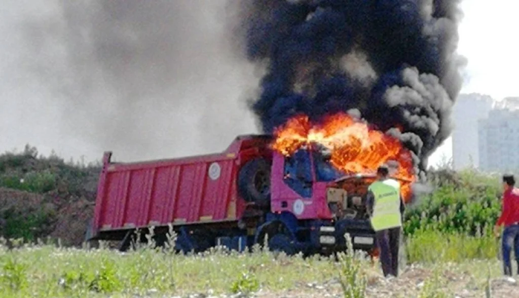 В четверг, 21 июня, около 9:30 на пустыре на Правом берегу при загрузке землёй загорелся самосвал.