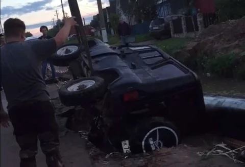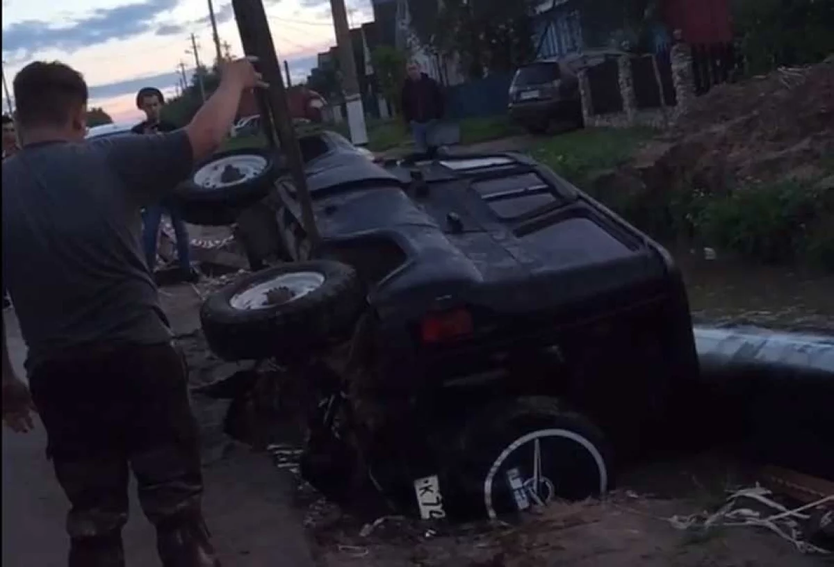 Дело в том, что в этом месте разрыли котлован для ремонта трубопровода. Яма подходила вплотную к дороге и, видимо, УАЗ заехал на нее колесом, соскользнул, завалился набок и наполовину утонул.