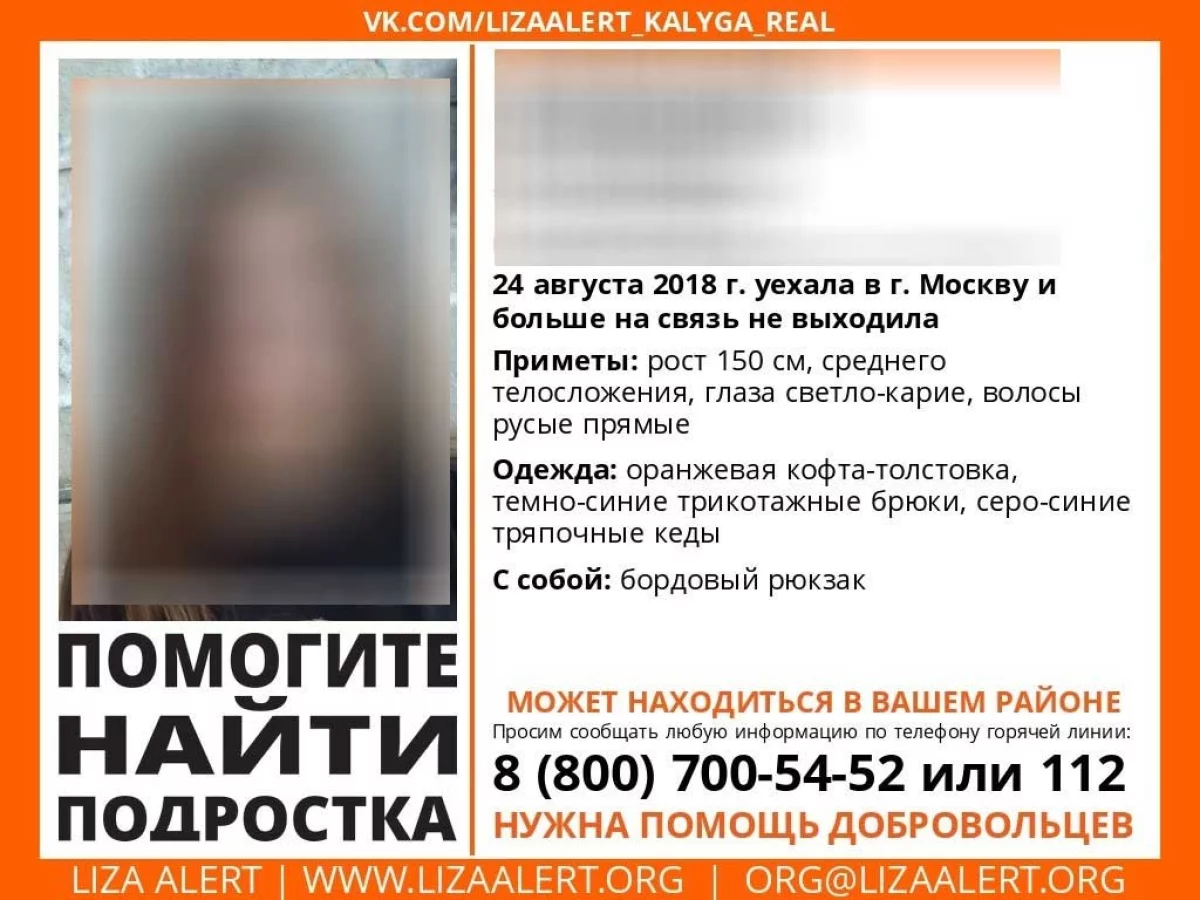 15-летнюю девочку разыскивают в Калуге и в Москве. Она уехала из областного центра 24 августа в столицу и больше на связь не выходила, сообщает во вторник, 28 августа, поисковый отряд «Лиза-Алерт Калуга».