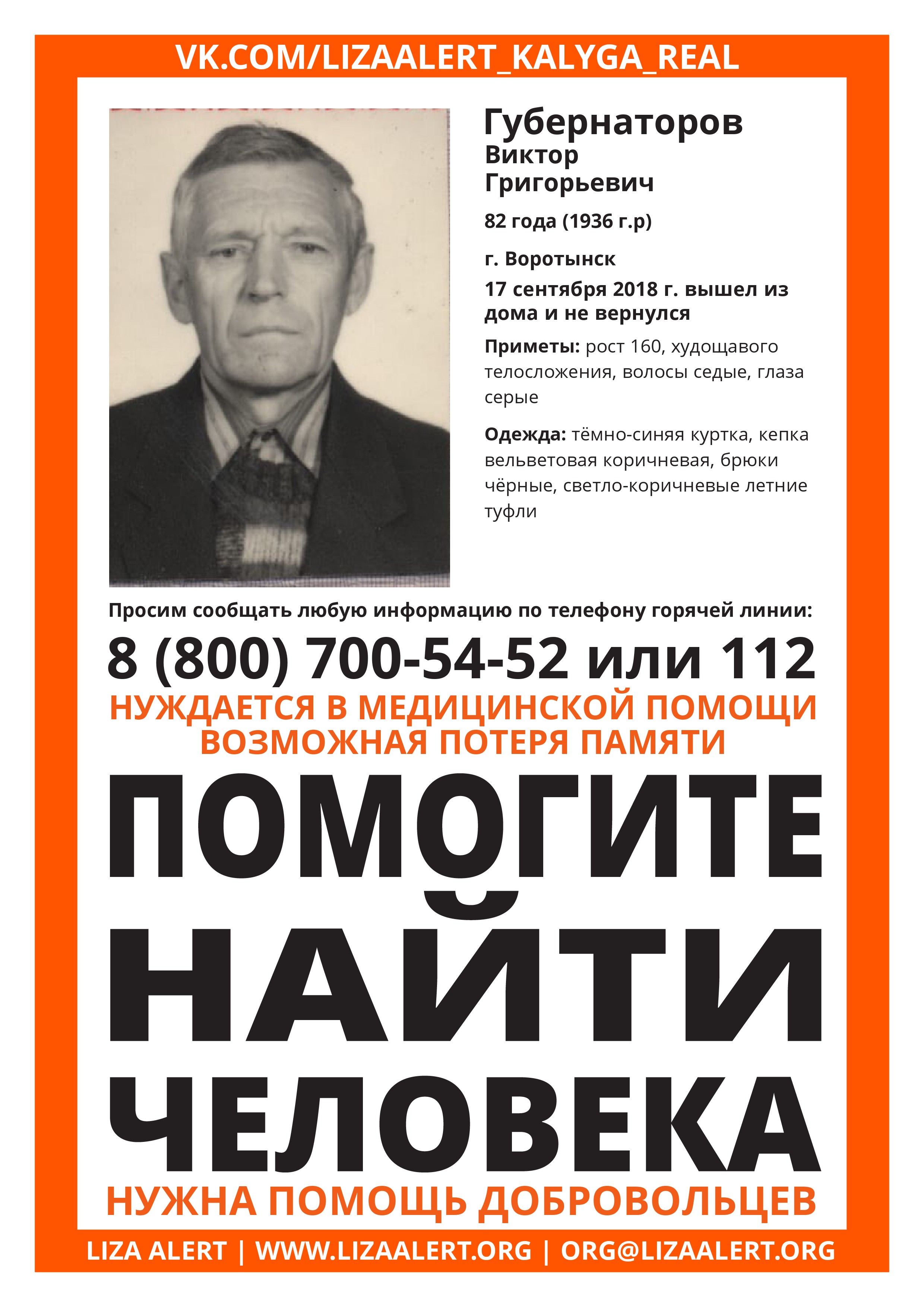 В понедельник, 17 сентября, около 11:00 ушёл из дома и не вернулся 82-летний Виктор ГУБЕРНАТОРОВ. Мужчина проживает в Воротынске, сообщает поисково-спасательный отряд «Лиза Алерт».