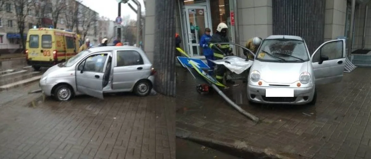 По предварительным данным ГИБДД, 77-летний водитель «Матиза» не уступил дорогу другой машине. От удара малолитражка вылетела на тротуар и снесла знак.