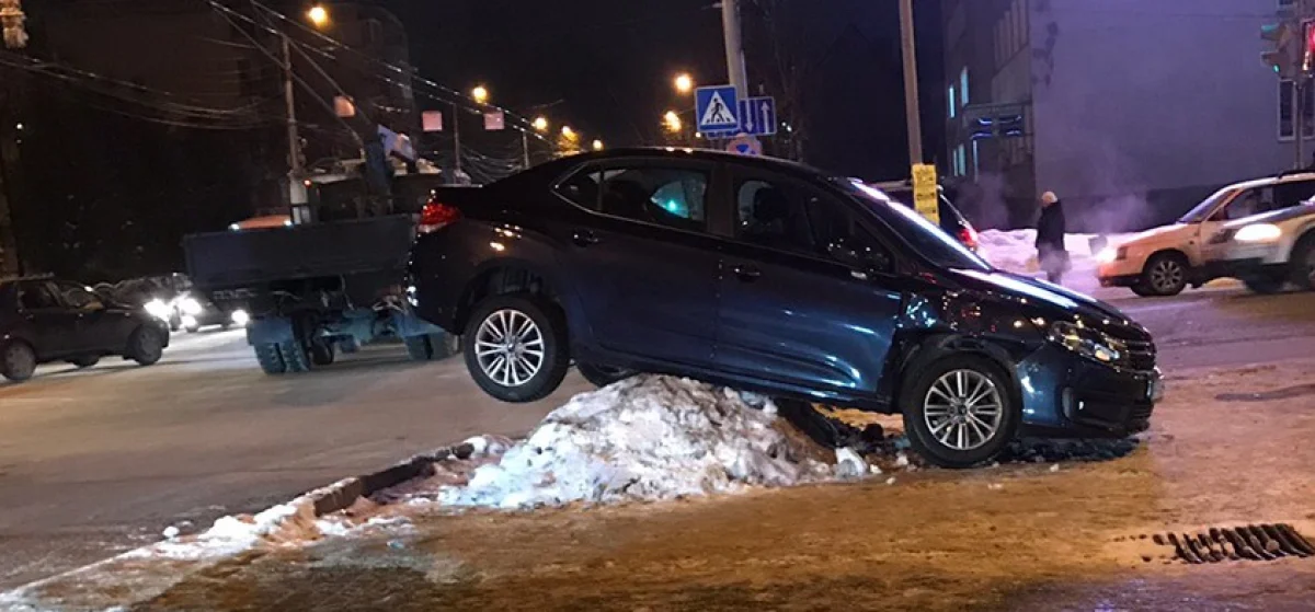 Как сообщают очевидцы, водитель «Ситроена» уходил от столкновения, а сугроб спас пешеходов, которые находились на тротуаре.