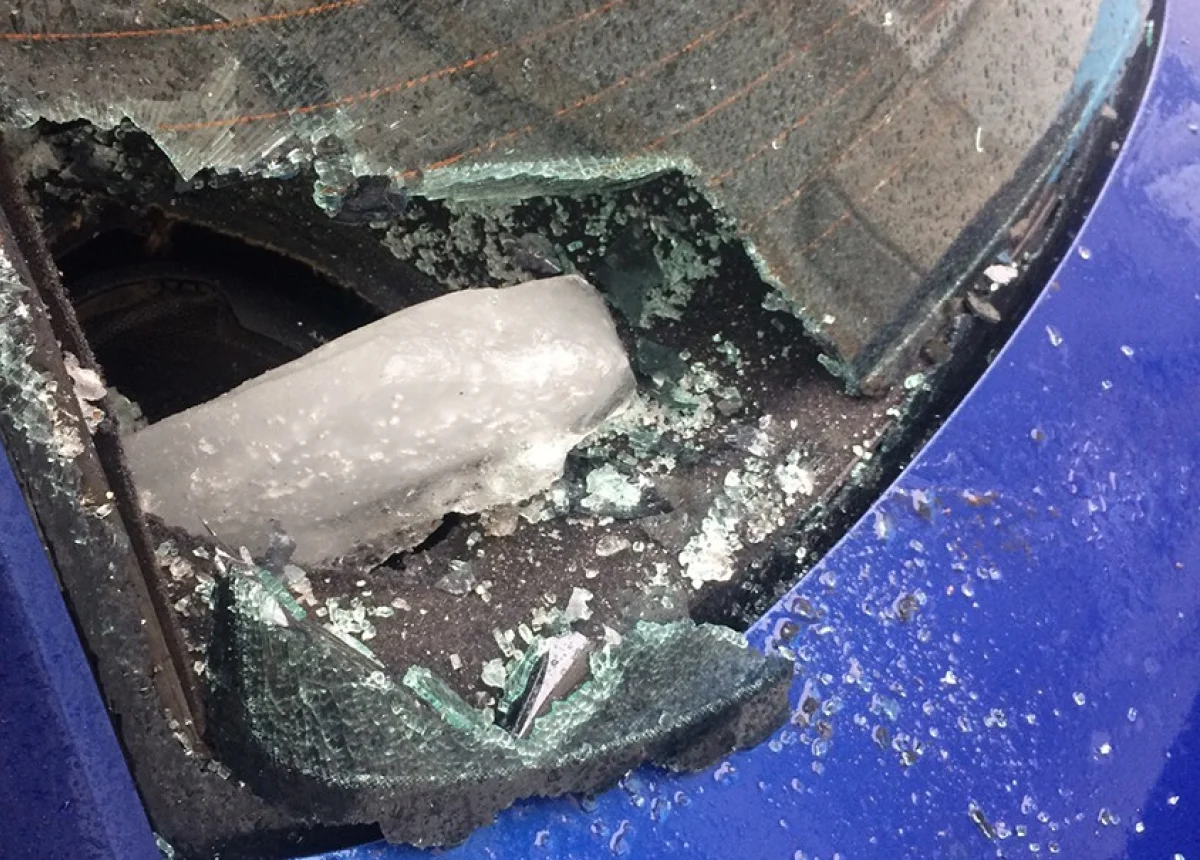 На бульваре Моторостроителей у дома №5 кусок льда прилетел с крыши девятиэтажки в стекло «Лады».