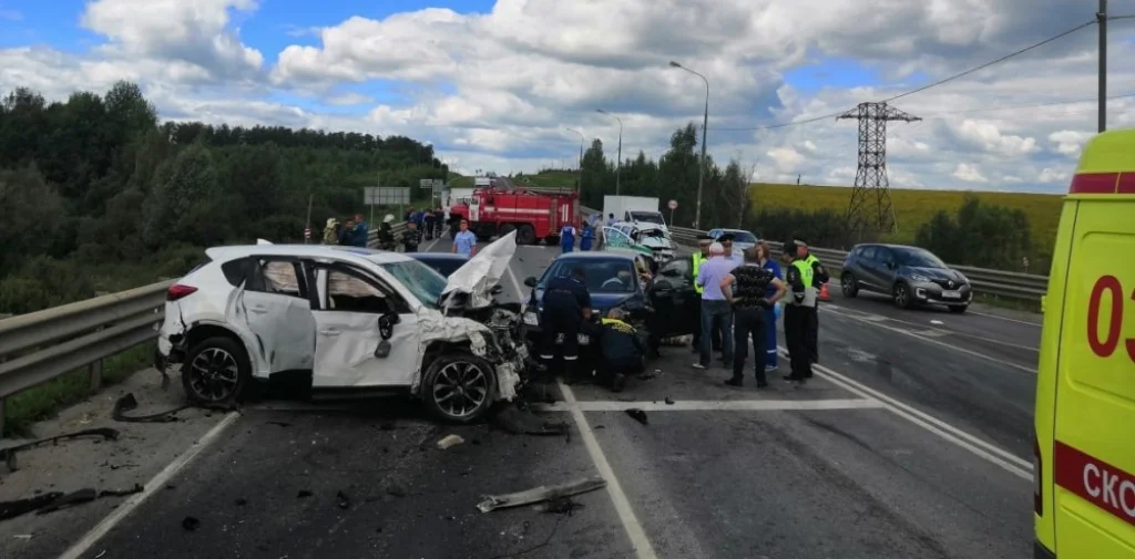 Около 12:55 в понедельник, 12 августа, на 82 километре дороги Калуга – Тула в соседней области столкнулись четыре автомобиля: «Мерседес Е320», «Мазда СХ-5», «Шкода Октавия» и «Лада Ларгус», сообщает тульское областное управление МЧС.