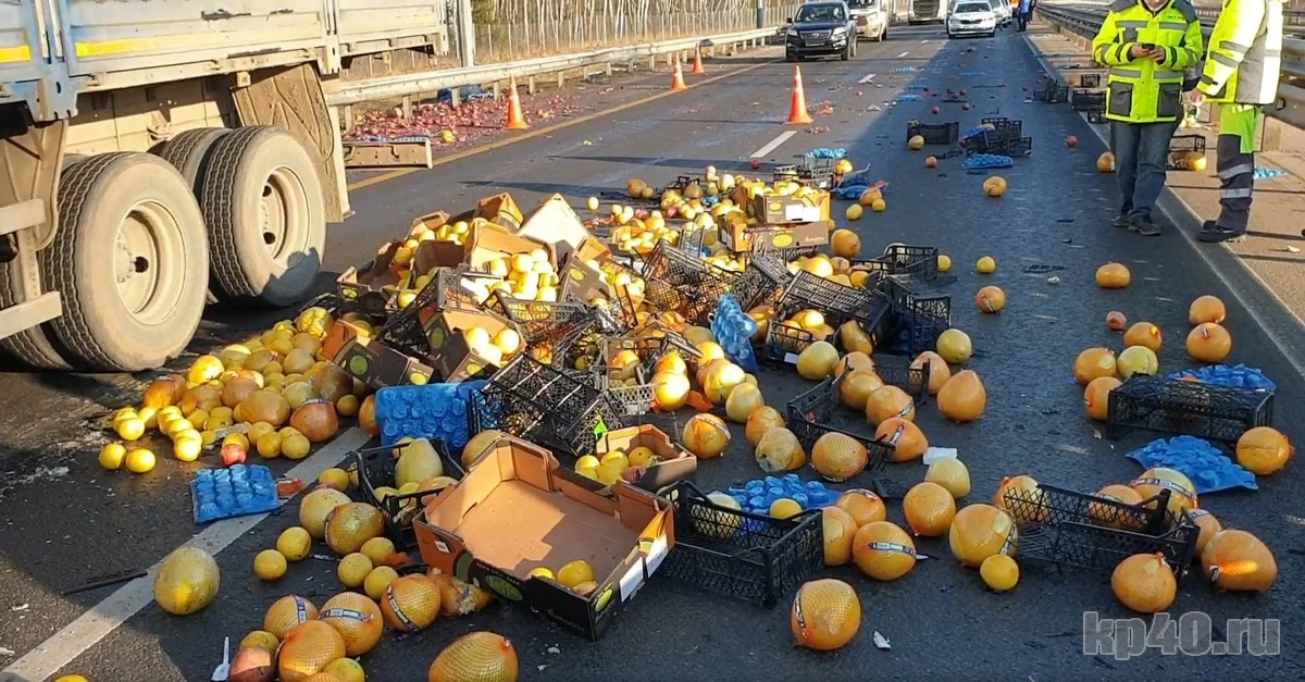 Около 8:30 утра в пятницу, 21 февраля, на трассе М3 «Украина» в Малоярославецком районе столкнулись два грузовика. Один из них перевозил фрукты, которые в результате столкновения высыпались на дорогу.