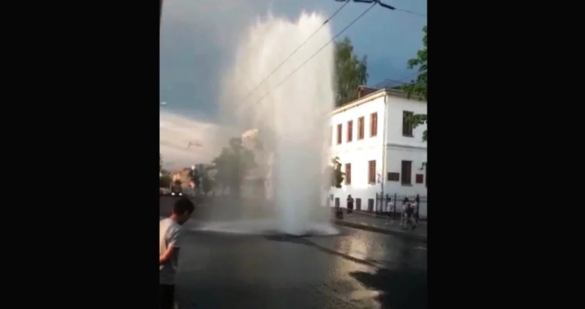 Вечером в среду, 10 июня, на улице Московской в Калуге в месте ремонта дороги прорвало трубу. Вода поднималась из земли на высоту почти в 10 метров.