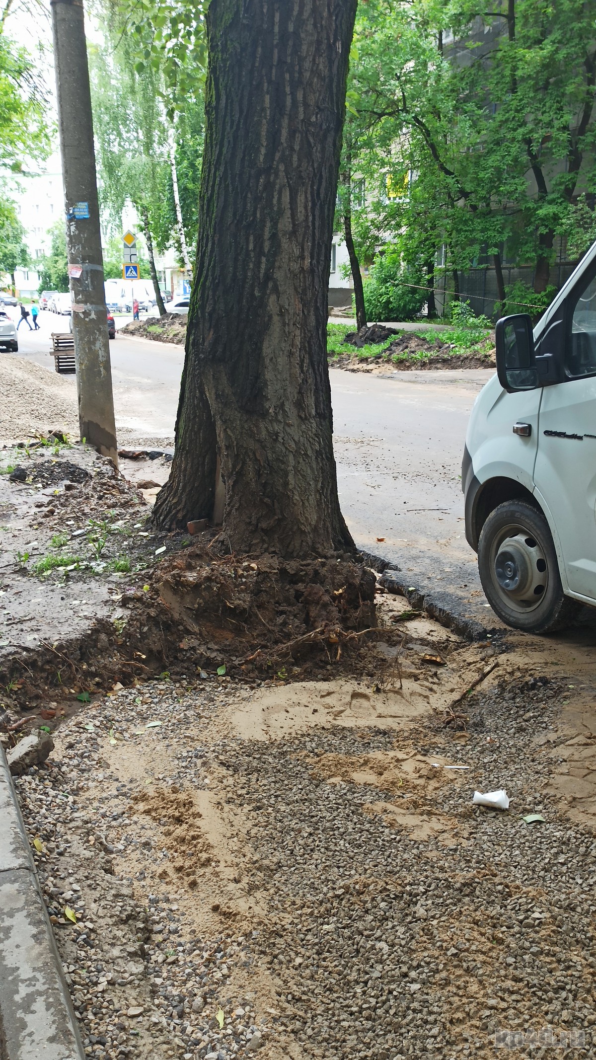 В Калуге на улице Большевиков идут дорожные работы. В результате обрублены корни и стёсаны стволы почти у всех деревьев по обеим сторонам дороги.