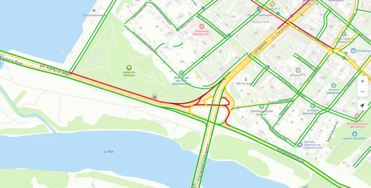 Машины стоят в пробке со стороны улиц Гагарина и Набережной.