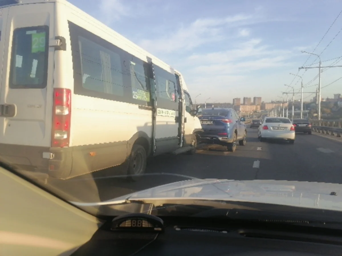 Утром во вторник, 6 октября, на Гагаринском мосту в Калуге столкнулись маршрутка №29 и легковой автомобиль, сообщают подписчики группы «Дорожный патруль-Калуга».