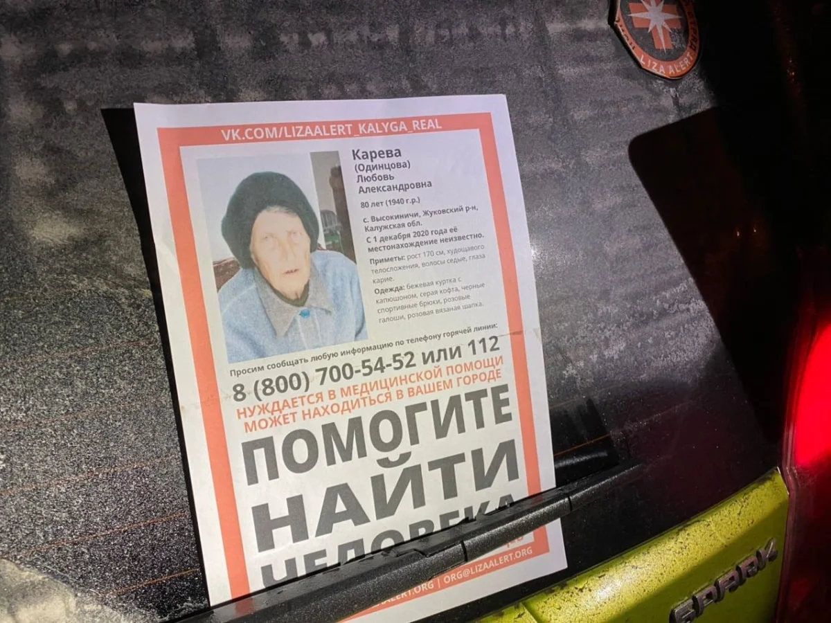 В селе Высокиничи Жуковского района Калужской области пропала 80-летняя Любовь КАРЕВА. Последний раз ее видели 1 декабря, сообщает в пятницу поисково-спасательный отряд «Лиза Алерт Калуга».