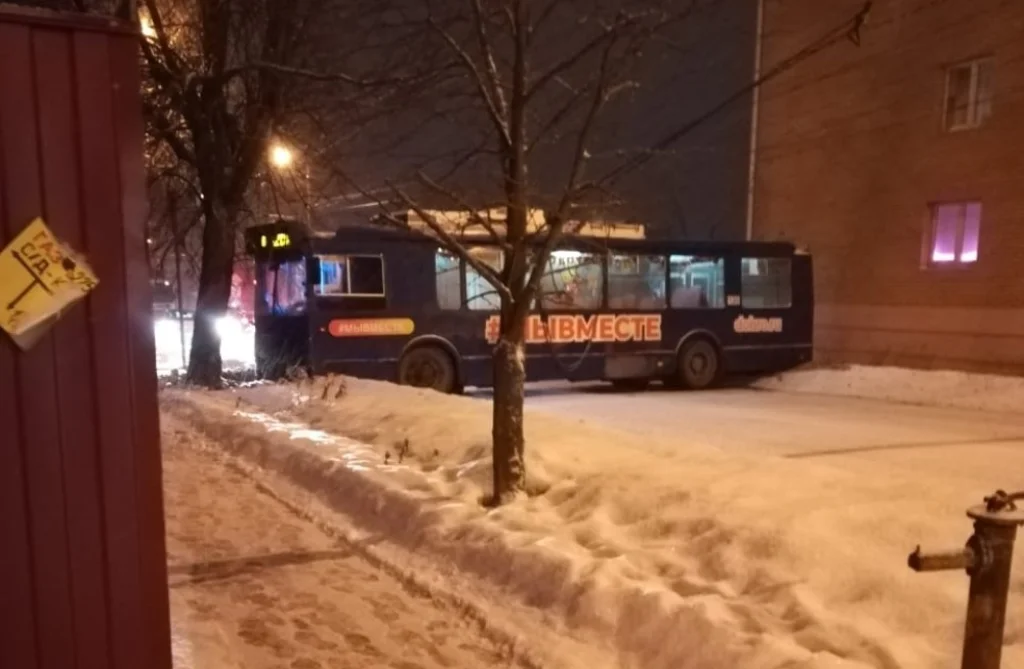 Вечером в пятницу, 29 января, на улице Чапаева в Калуге недалеко от площади Маяковского произошло ДТП с участием троллейбуса. Во время снегопада следовавший по шестому маршруту «рогатый» развернуло, и он полностью перекрыл дорогу.
