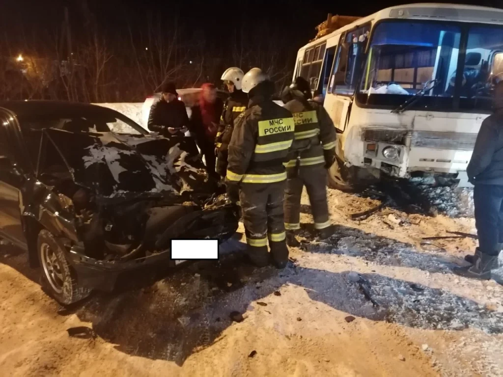 У легковушки разбита вся передняя часть. У автобуса повреждения в районе правого переднего колеса.