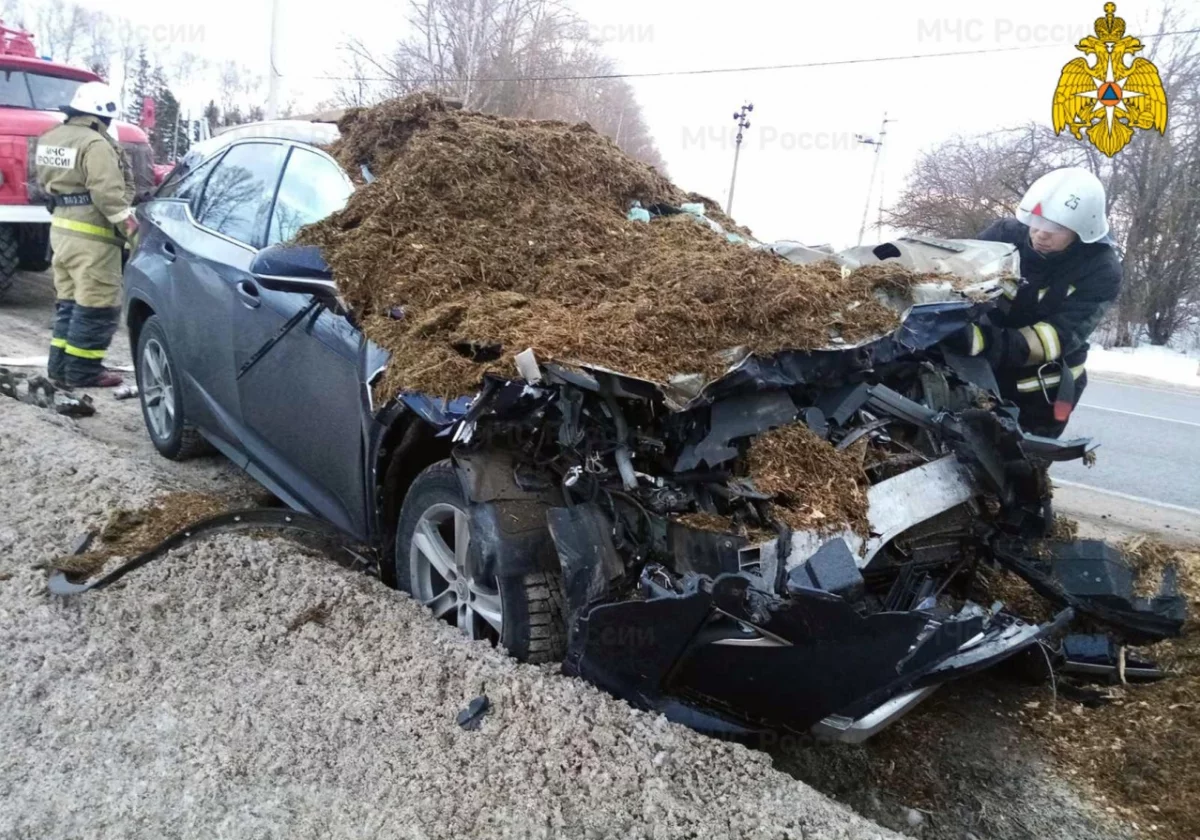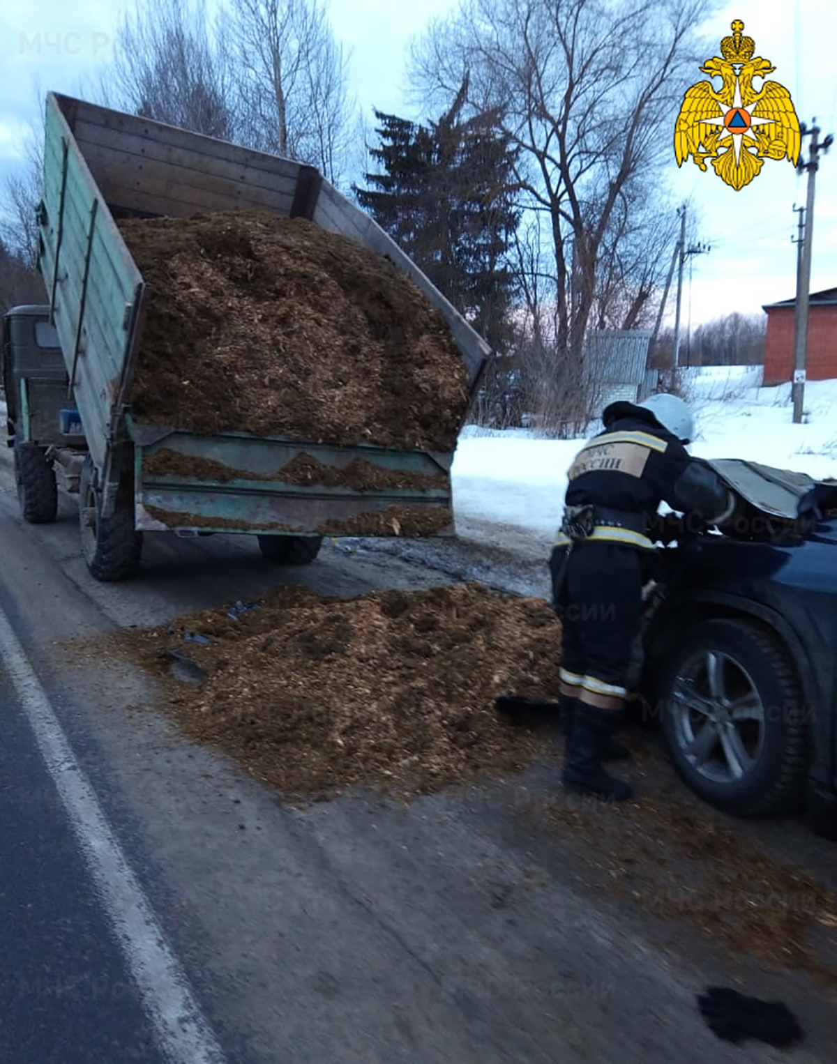 Спасатели опубликовали фото с места происшествия. Судя по снимкам, легковой автомобиль врезался в заднюю часть грузовика. После этого на «Лексус» высыпался навоз, который находился на прицепе самосвала.