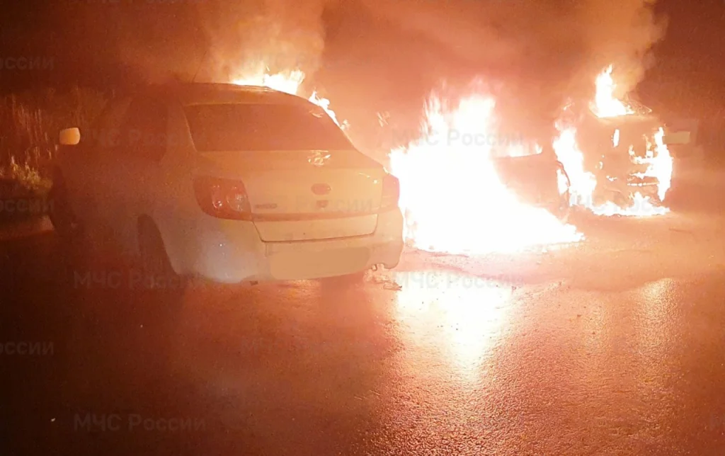 Фото с места пожара. Одна машина сгорела, две повреждены, еще две удалось спасти.