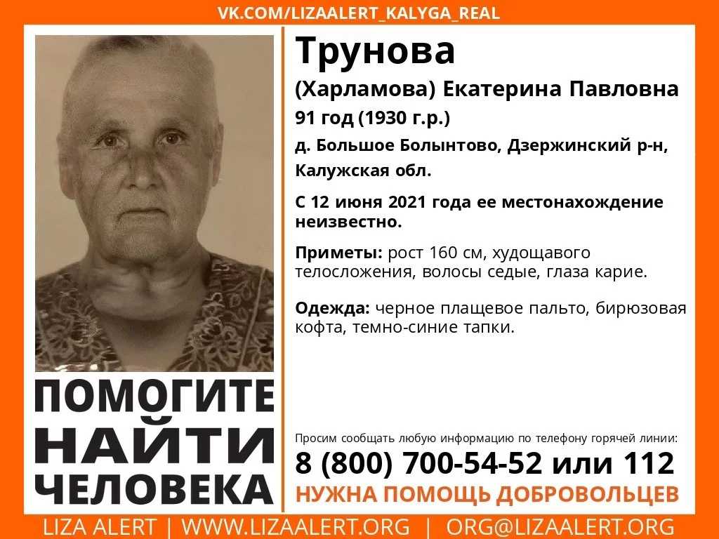 Поисково-спасательный отряд «Лиза Алерт» сообщил о пропавшей 91-летней пенсионерке. Жительница деревни Большое Болынтово Дзержинского района Екатерина Павловна Трунова (Харламова) 12 июня не вернулась с прогулки.