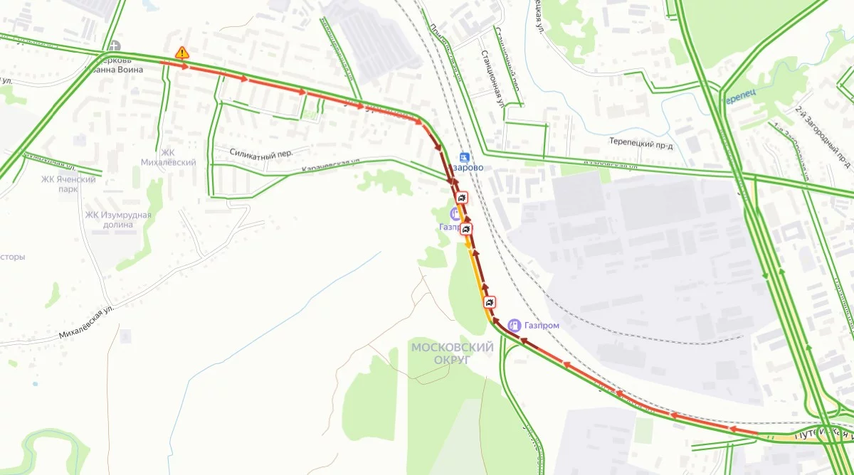 Движение по улице Гурьянова затруднено в обе стороны. Место аварии объезжают по территории заправки.