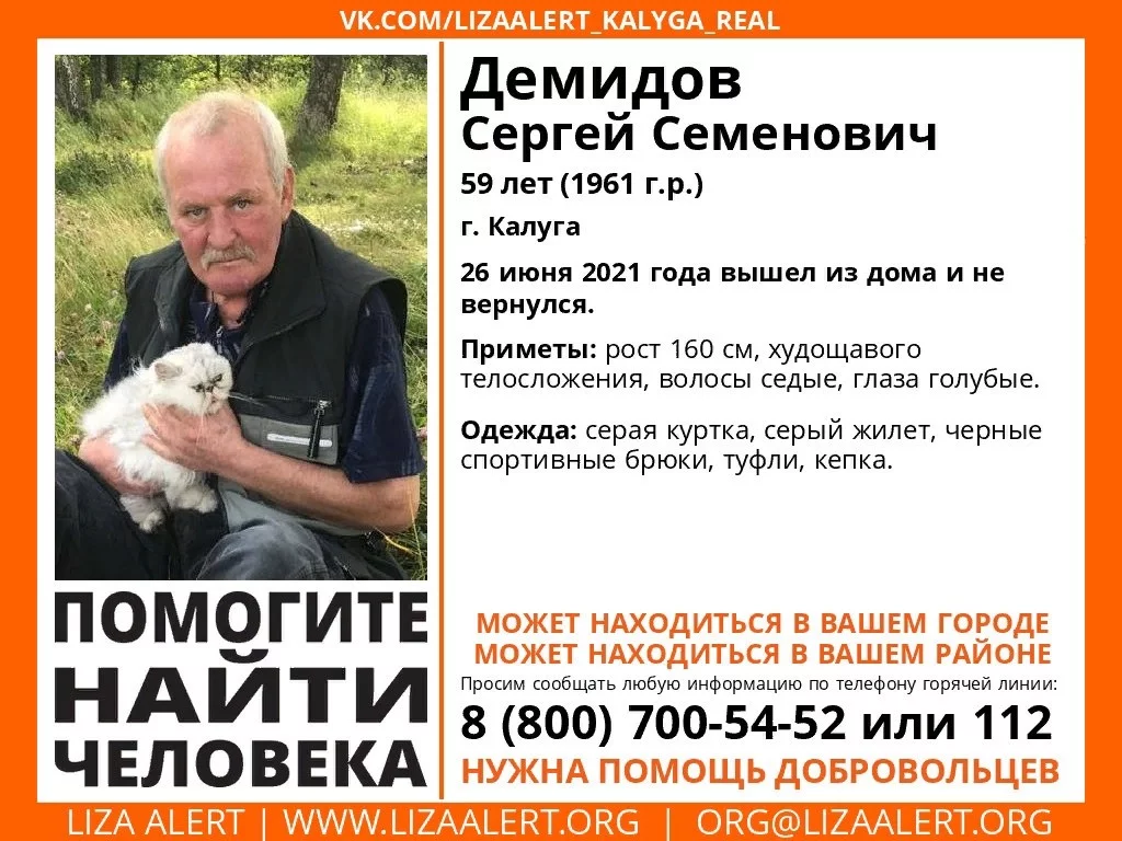 59-летний ДЕМИДОВ Сергей Семенович пропал в Калуге, передает поисково-спасательный отряд «Лиза Алерт» в субботу, 10 июля.