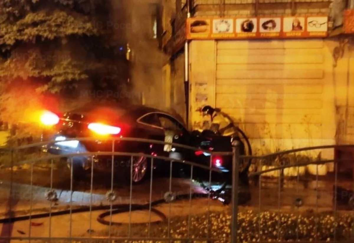После столкновения «Мерседес» врезался в фасад жилого дома и загорелся, а «Хендай» отлетел в дерево.
