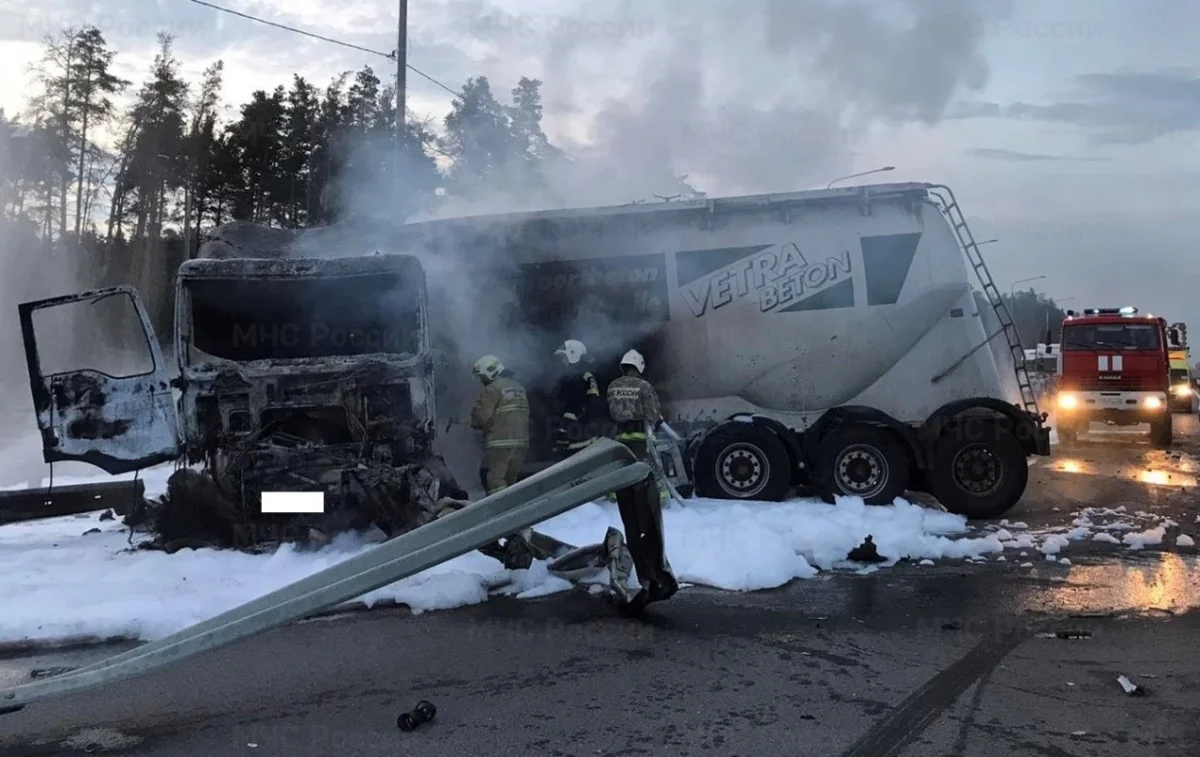 По предварительным данным, около 20:40 водитель цементовоза «МАН» не справился с управлением и врезался в металлический отбойник. После этого грузовик загорелся.