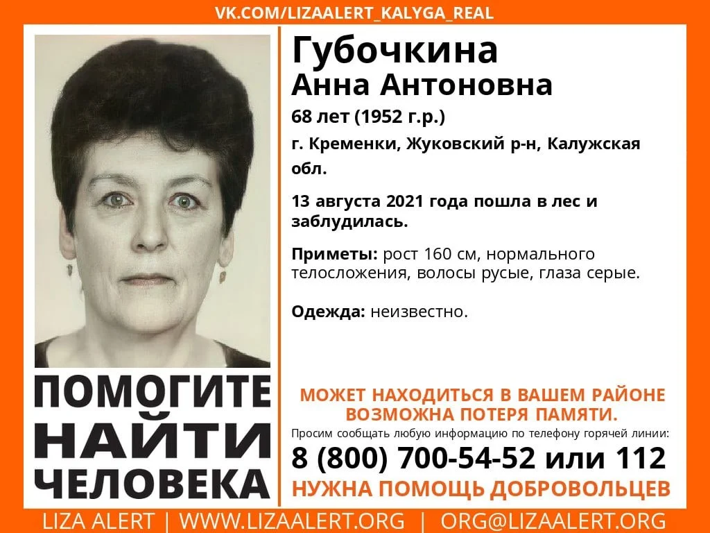 В Калуге пропала 68-летняя Анна ГУБОЧКИНА. Об этом в субботу, 14 августа, сообщили в поисково-спасательном отряде «Лиза Алерт».